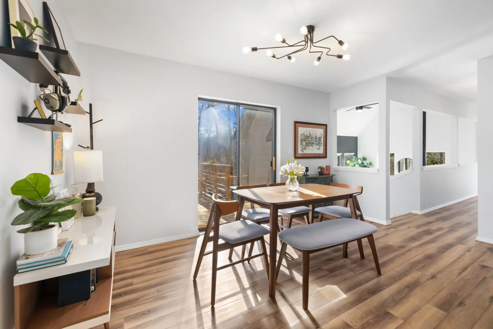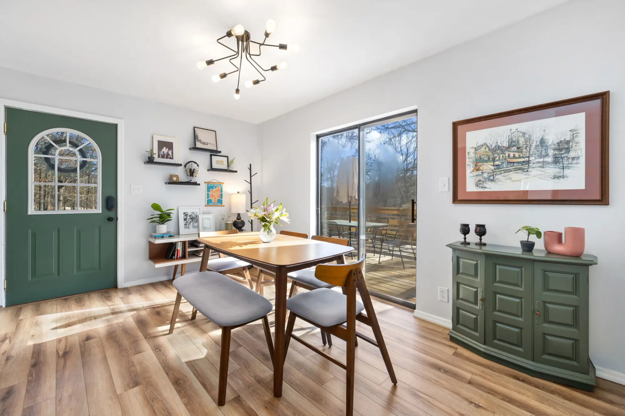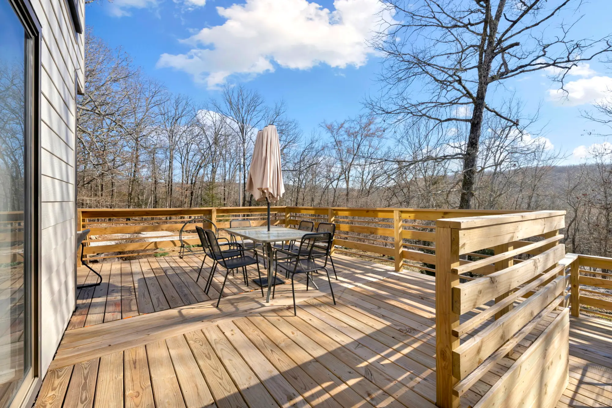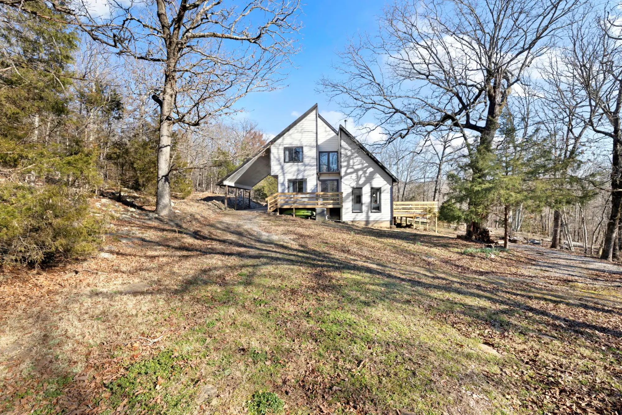 Tucked away on nearly 3 private acres just 12 minutes from downtown Fayetteville, this beautifully updated 3-bedroom, 2-bath home blends Chalet, A-frame inspired charm with modern upgrades. The split-level floor plan is filled with natural light, creating a bright, open feel that looks out into your own wooded paradise. Cosmetic upgrades include new paint, luxury vinyl flooring throughout, and fully redone kitchen and bathrooms. Even more important are the major improvements like a new roof in 2025, all new fiber cement siding, new hot water heater, and an expansive newly rebuilt deck - offering both peace of mind and standout curb appeal. Surrounded by mature trees and peaceful views, this property delivers privacy, style, and convenience in a hard to find price point. If you've been dreaming of living on some land while maintaining proximity to town, this one is for you!