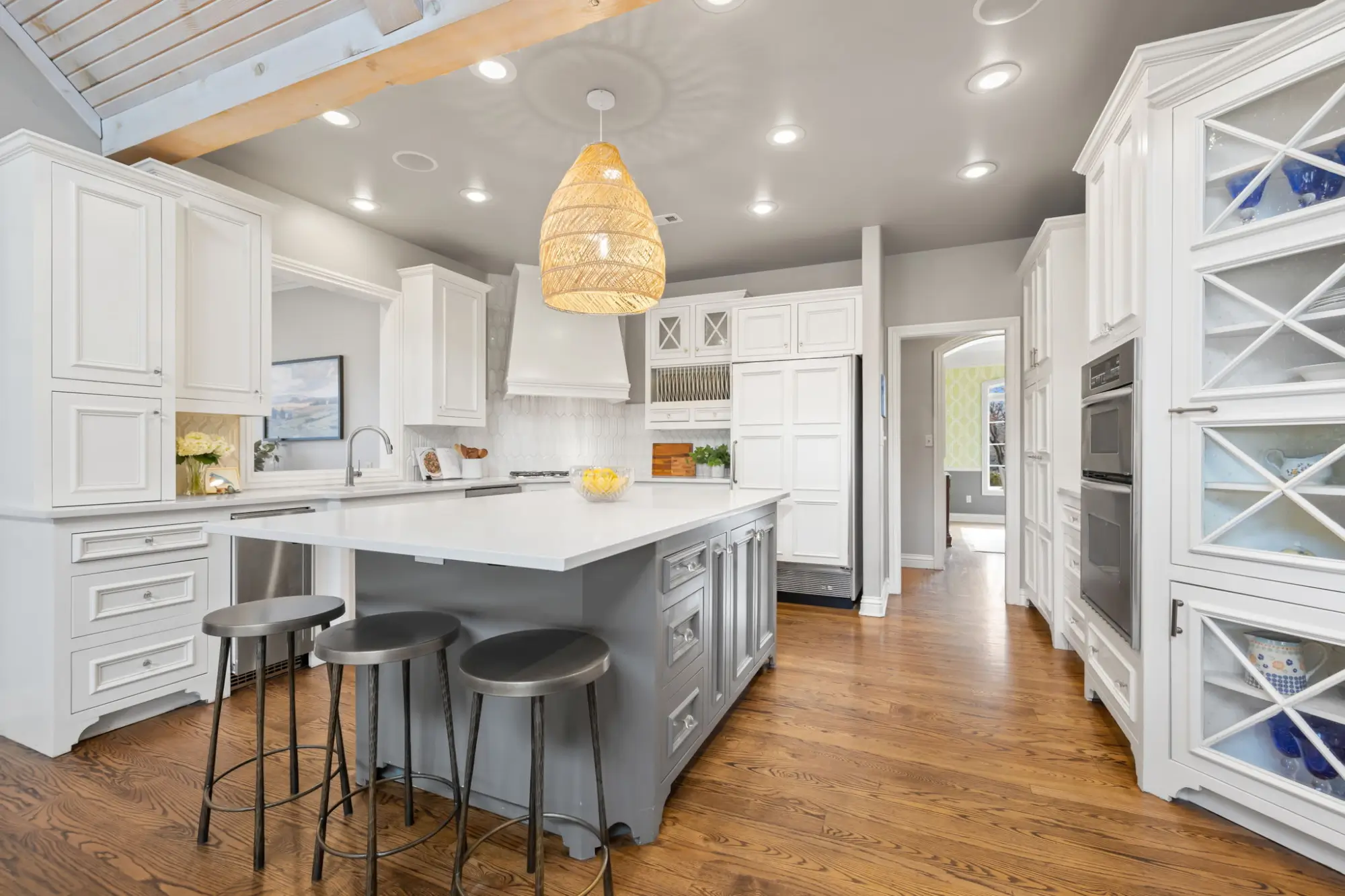 The kitchen is built for real cooking: 6-burner gas range with vent hood, wall oven plus convection microwave, trash compactor, sonic ice machine, and a cabinet-trimmed subzero refrigerator, with a full-size freezer separately in the utility room.
