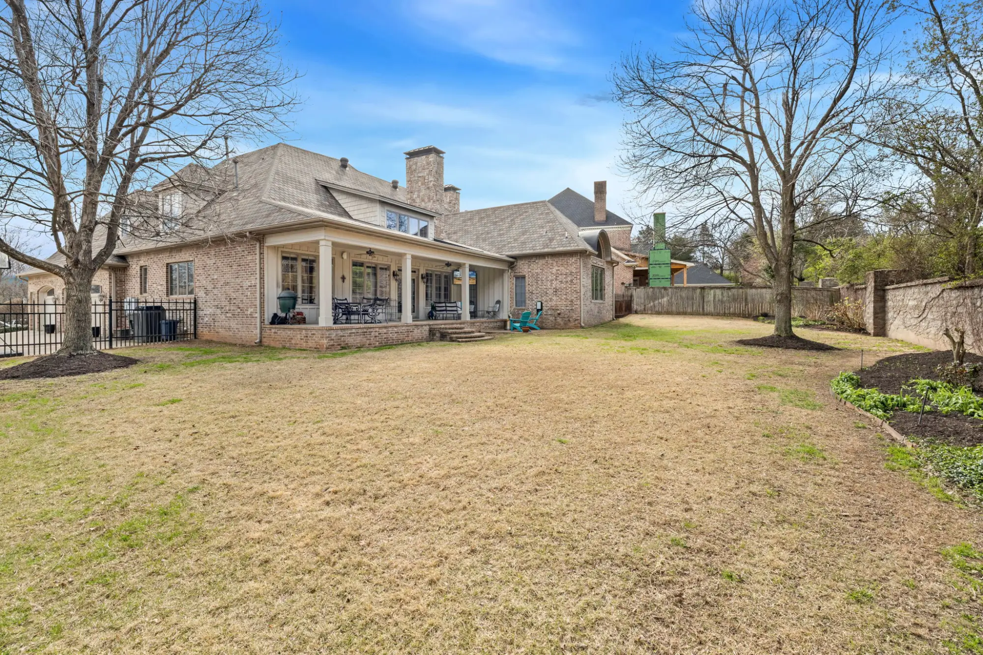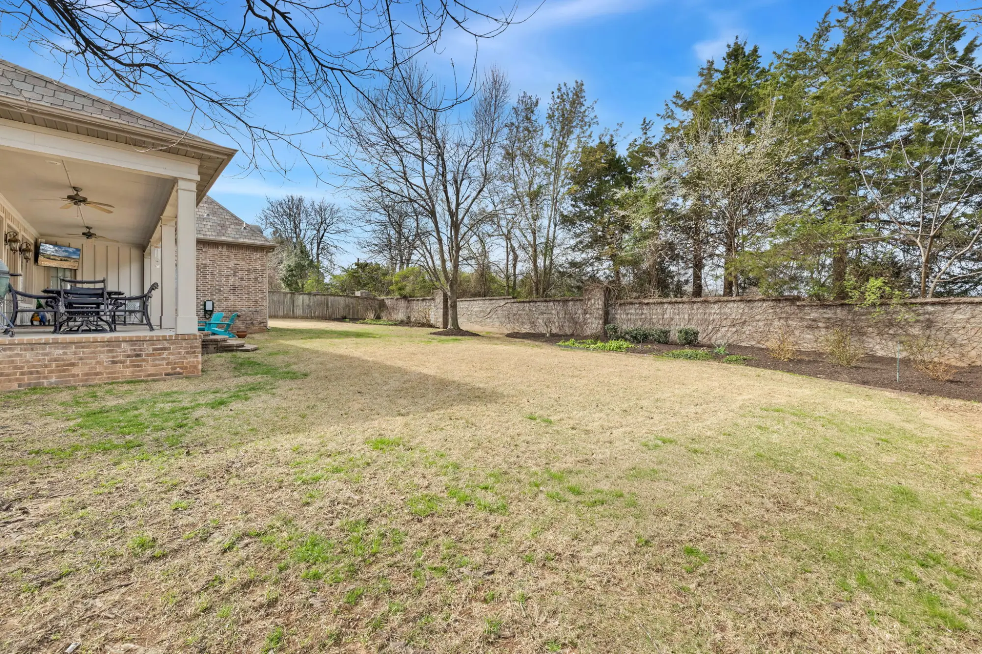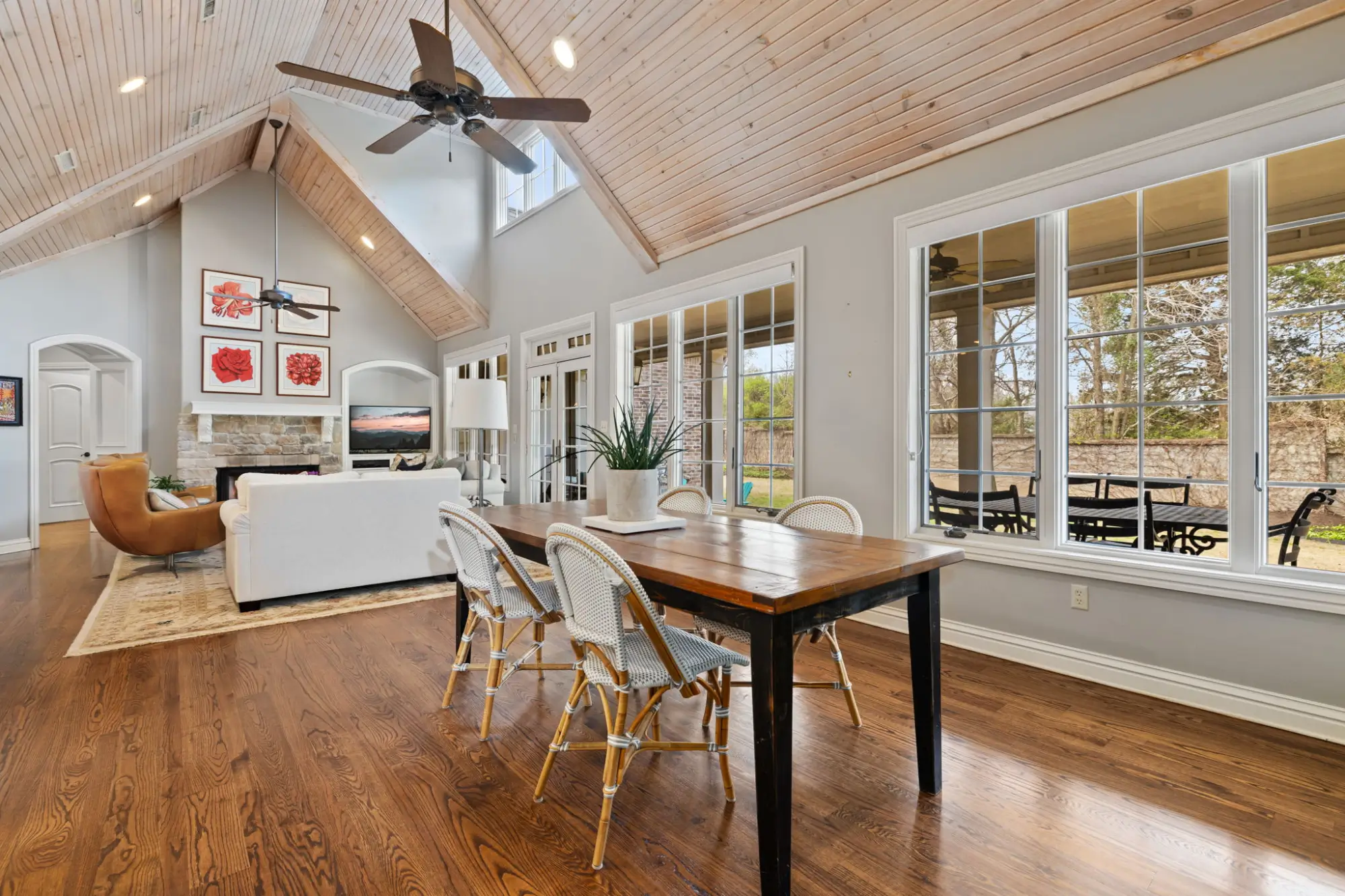 The main living area centers on a large stone fireplace and opens to a wide covered back porch with TV and a big, usable yard.