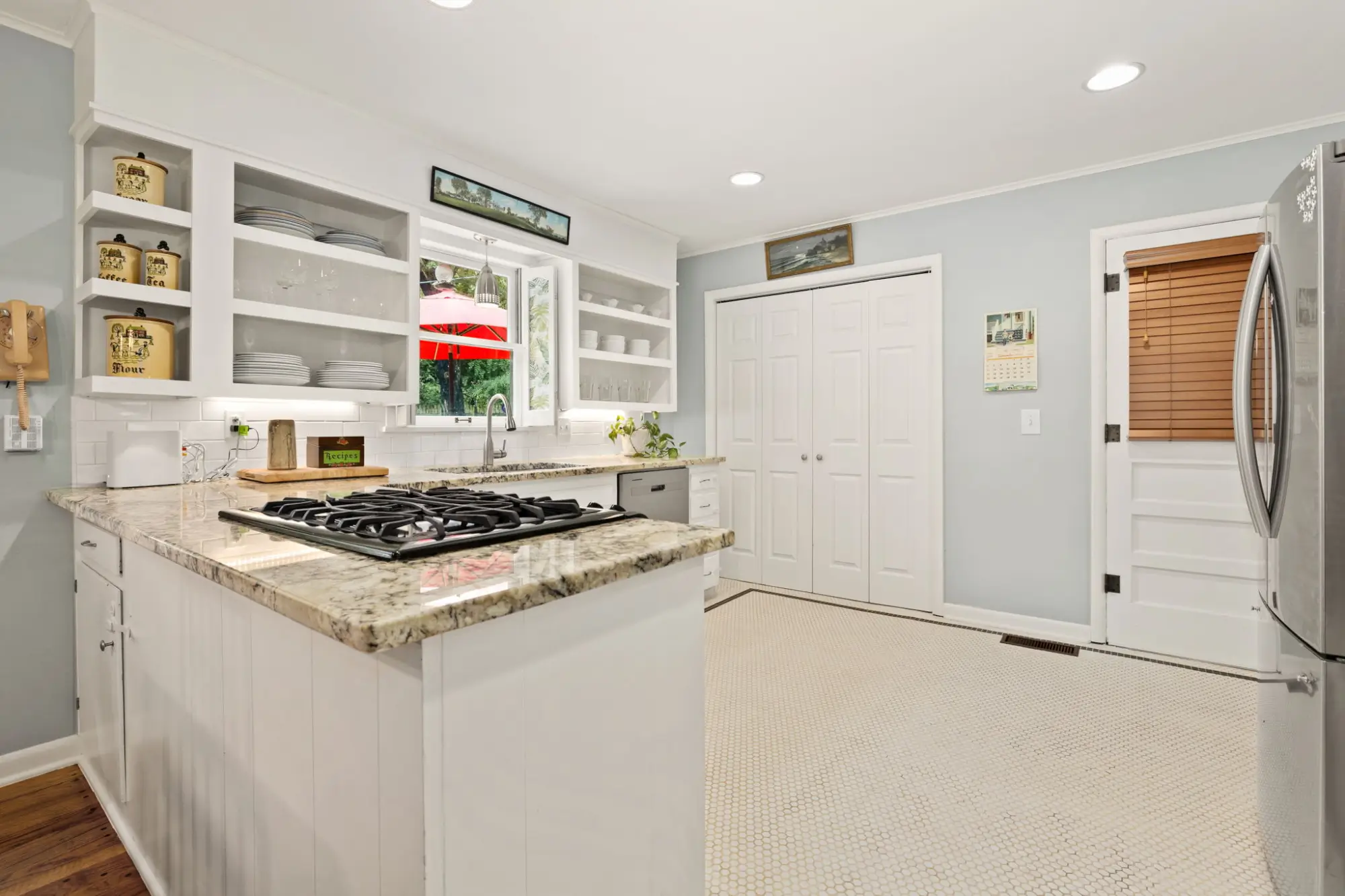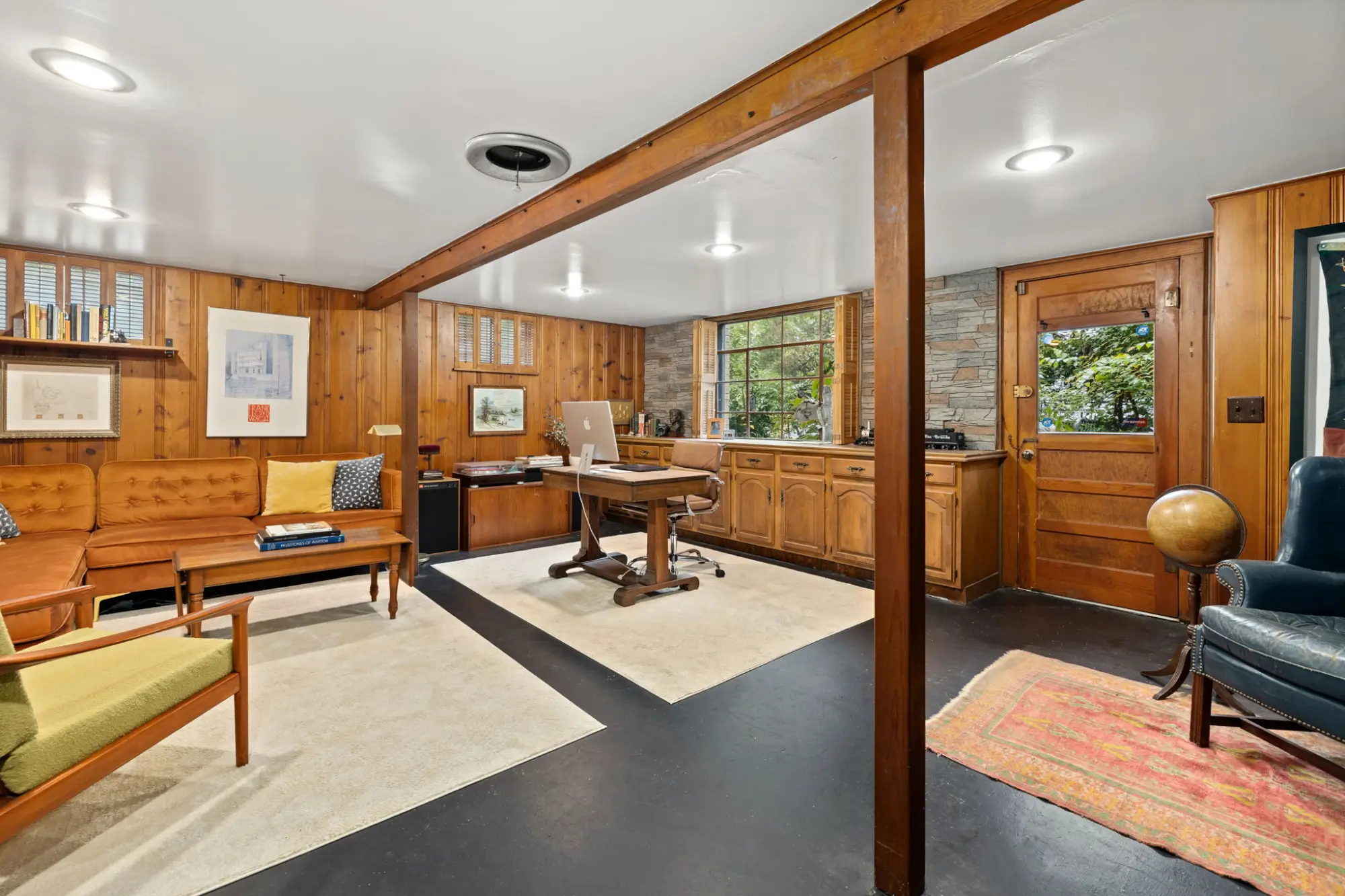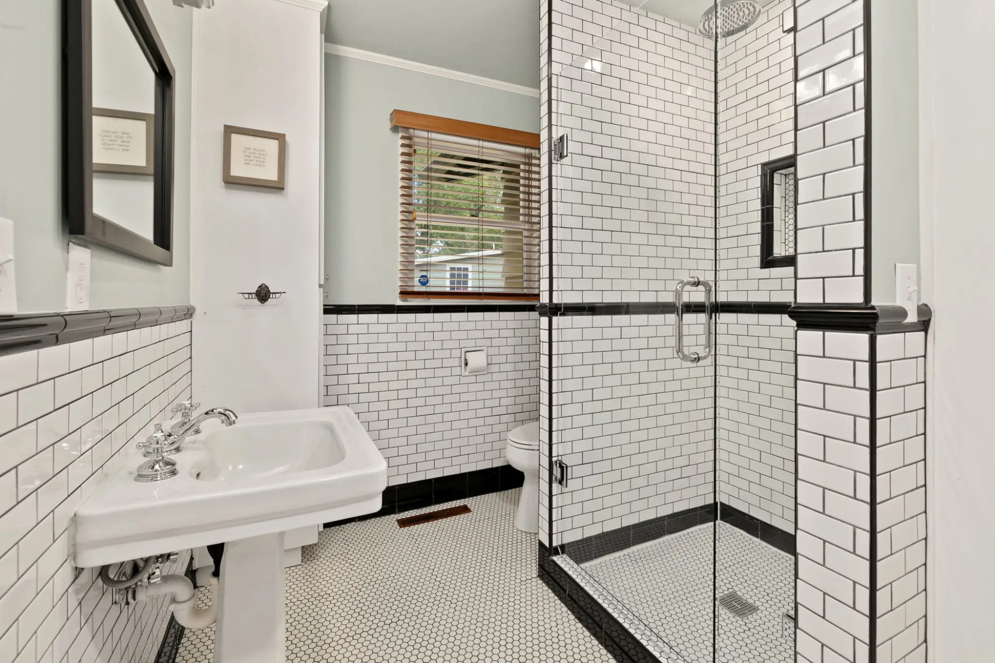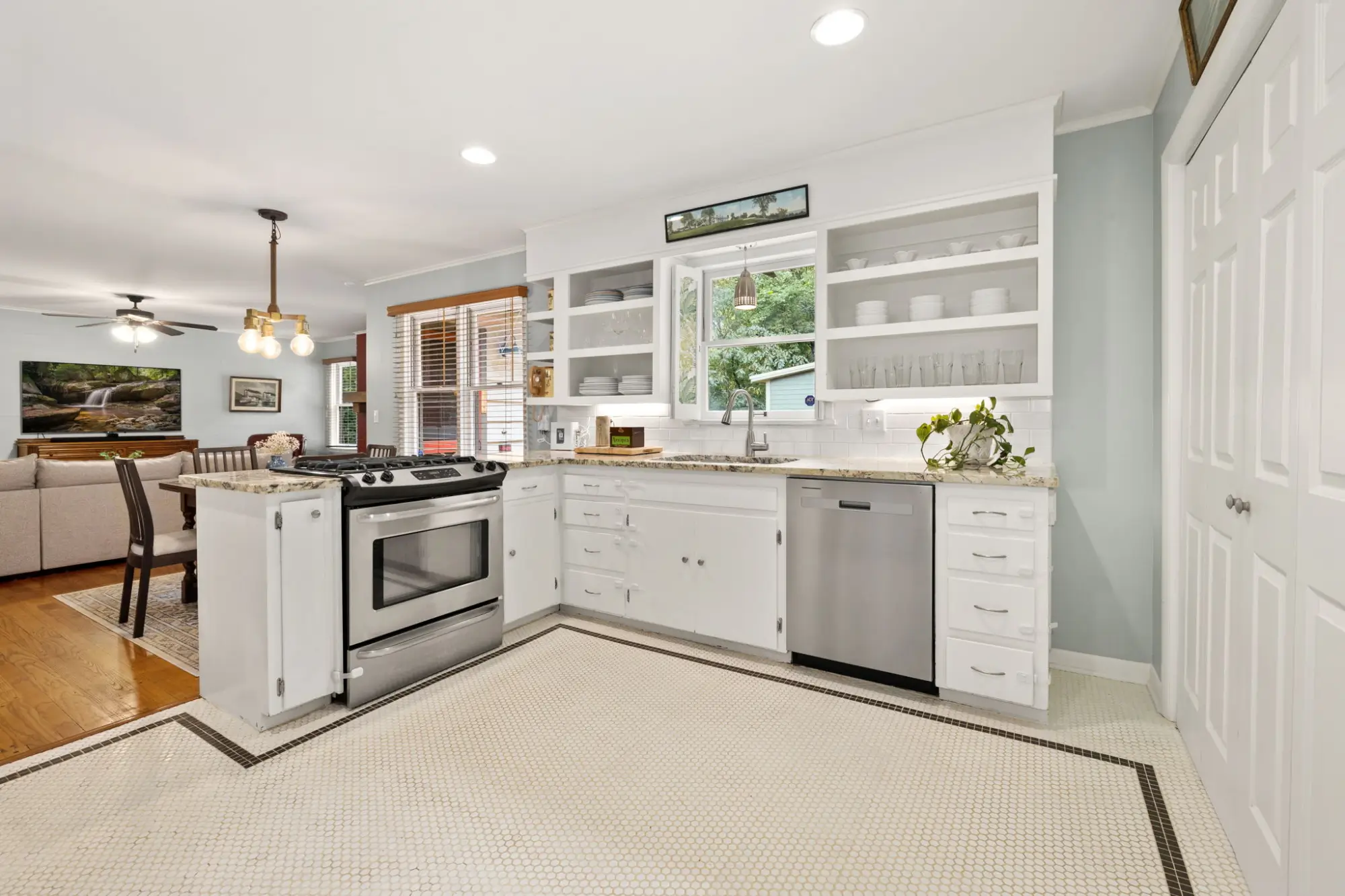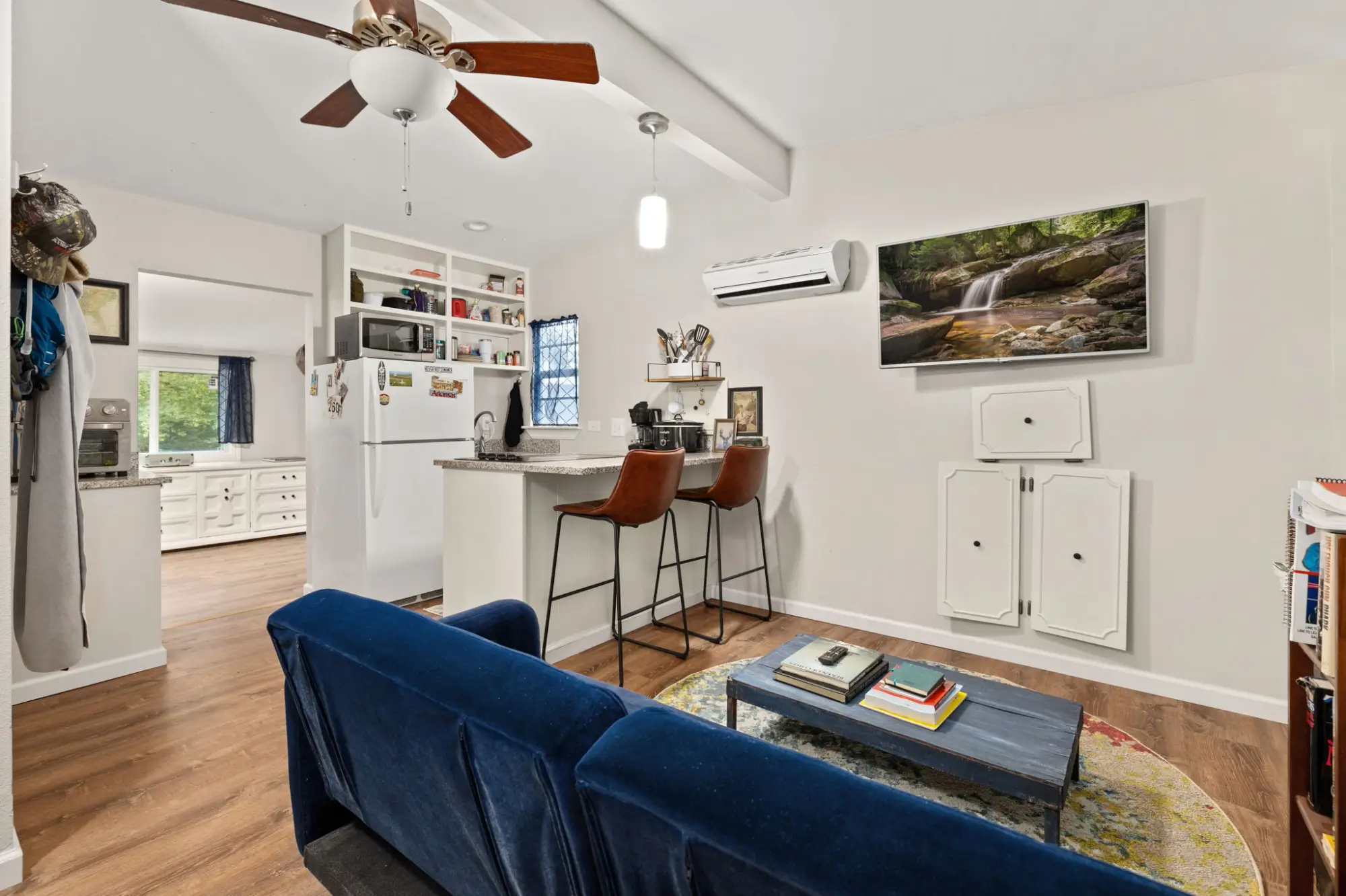 The main home has been beautifully restored and features the original wood floors, a cozy wood-burning fireplace, and updated kitchen and bathrooms with classic, time-period finishes.