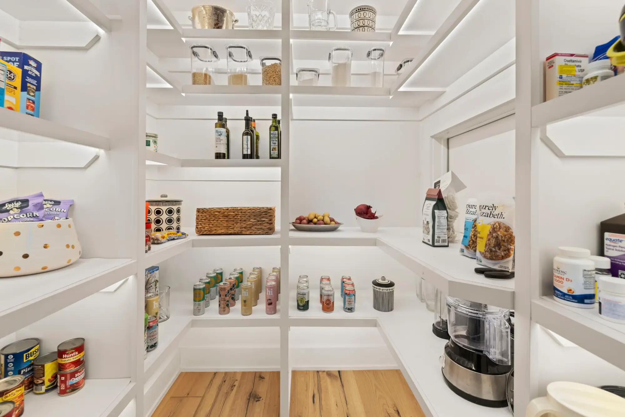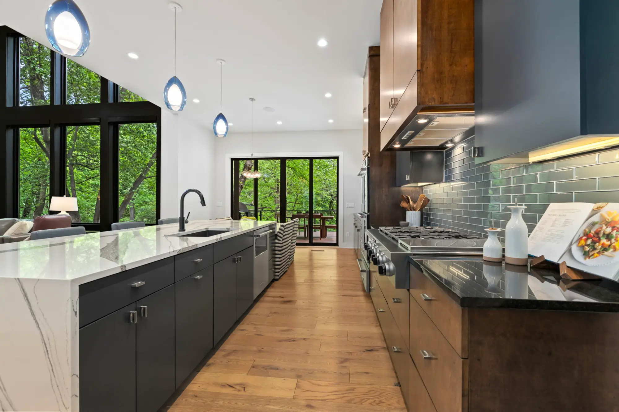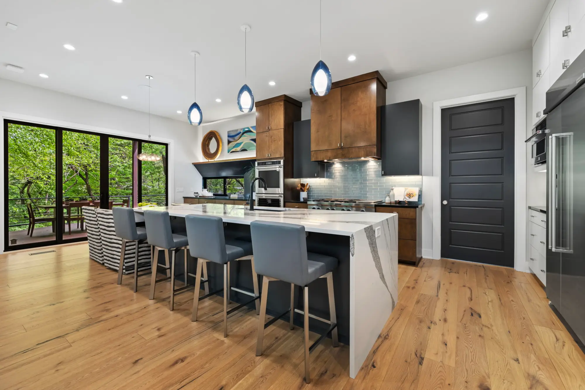 Waterfall-edge quartz island, professional-grade appliances, walk-in pantry