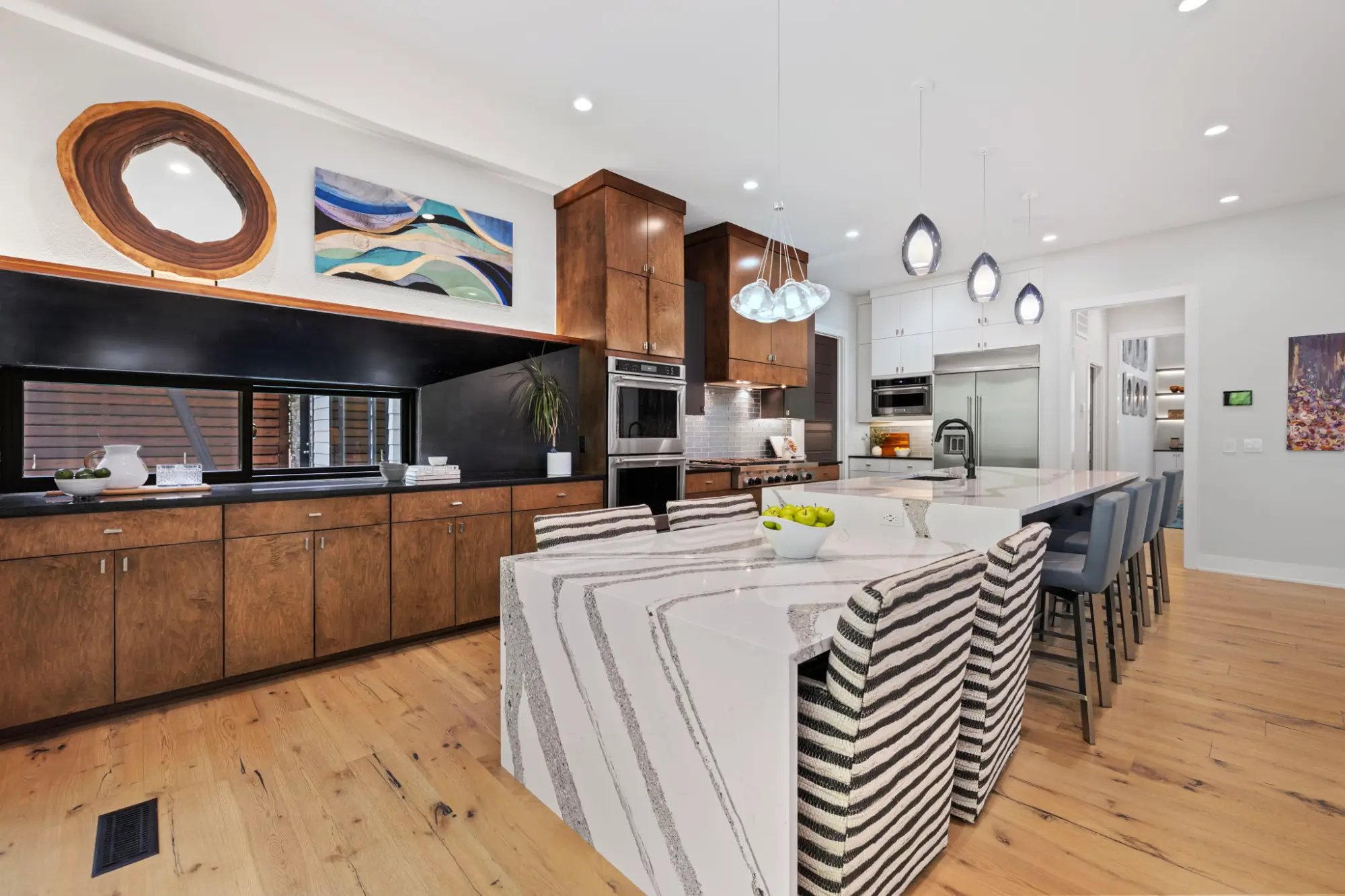 The kitchen is unapologetically functional, designed for both daily use and elevated entertaining. A waterfall-edge quartz island serves as the centerpiece, complemented by a secondary built-in dining surface. Professional-grade appliances - including a gas cooktop with griddle, double ovens, commercial vent hood, built-in refrigerator, and separate microwave - integrate seamlessly into a blend of custom-painted and walnut cabinetry. A walk-in pantry with backlit shelving connects directly to the oversized three-car garage through a pass-through door - a practical detail that simplifies everyday living.