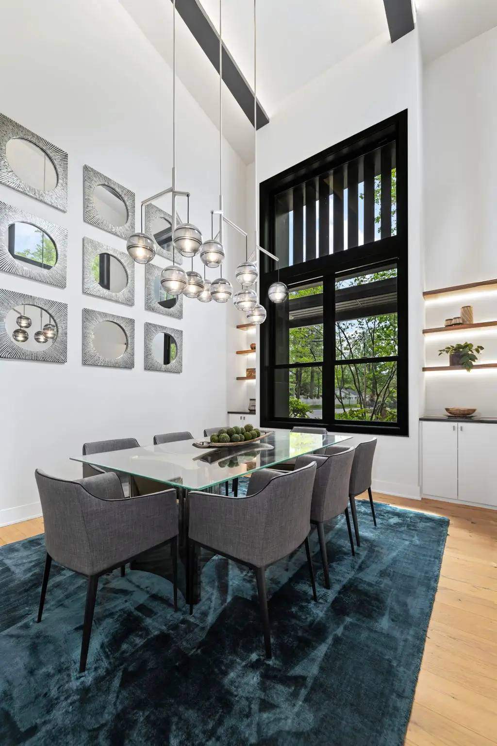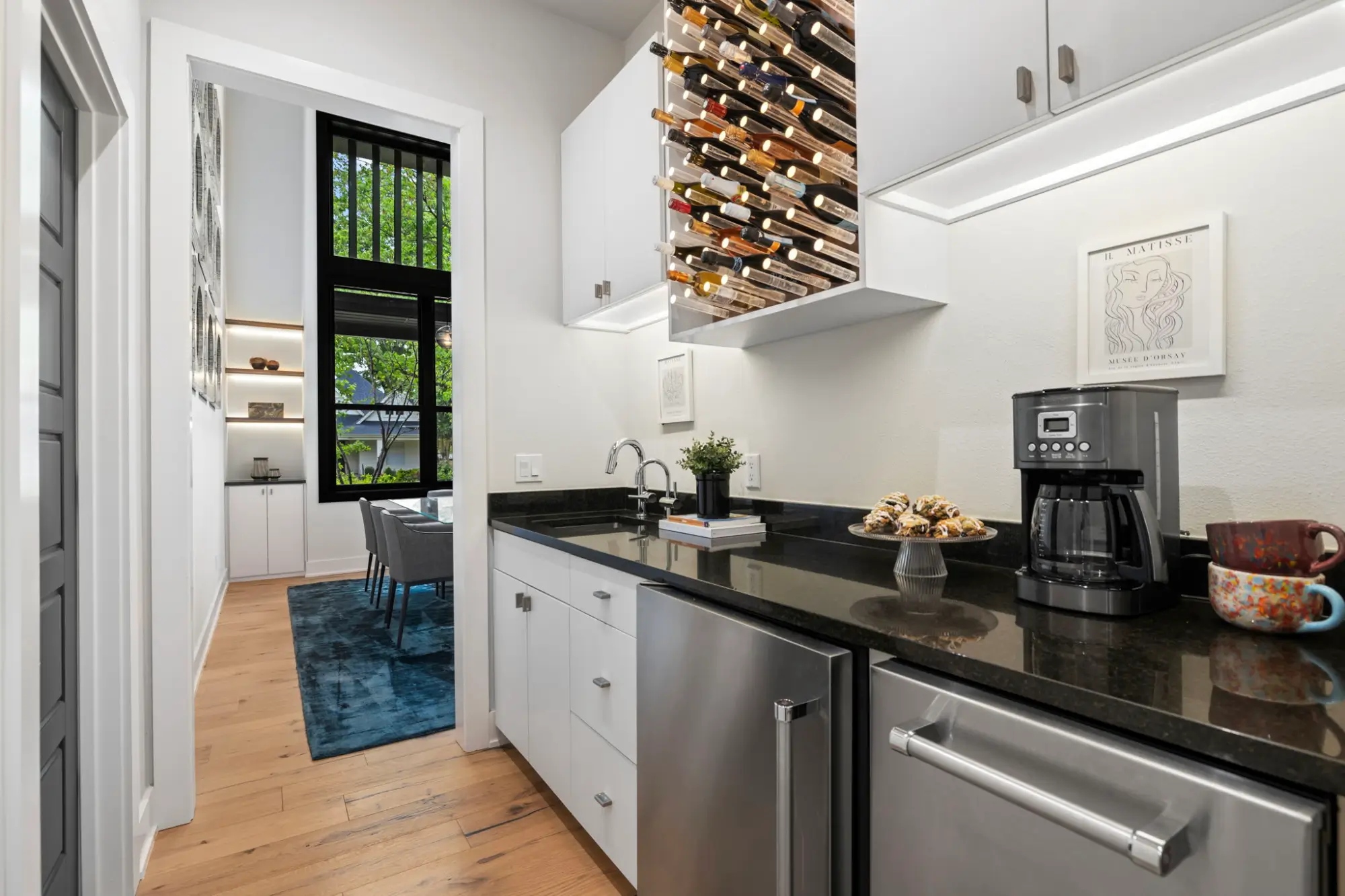 Supporting spaces are equally resolved. A butler’s bar with backlit lucite wine storage, ice maker, and refrigerator sits opposite the pantry, while an additional bar in the dining room expands hosting capacity without interrupting flow.