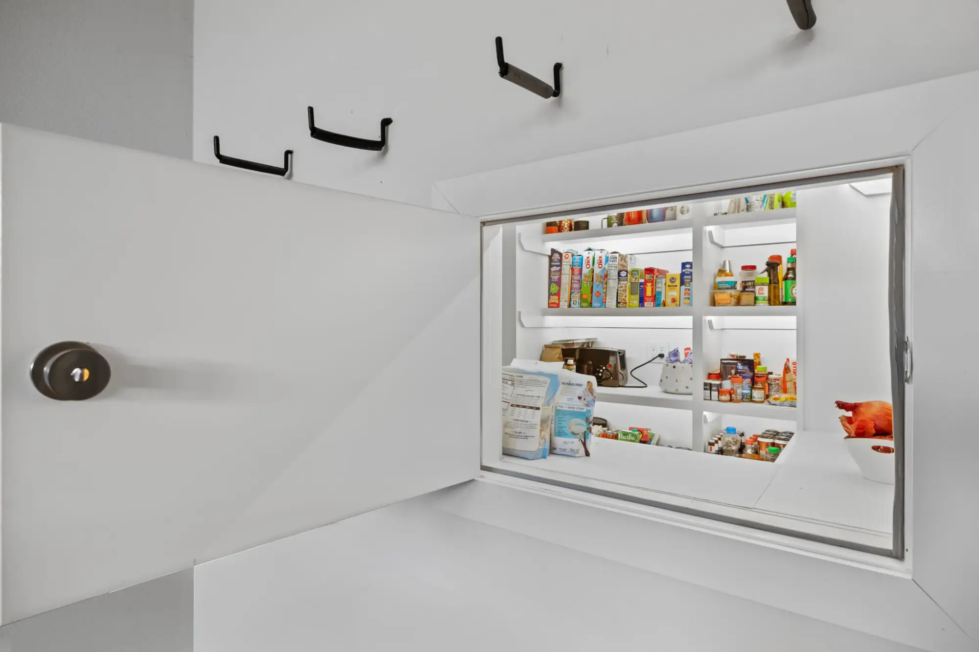 Oversized 3-car garage with storage and pass-through pantry access