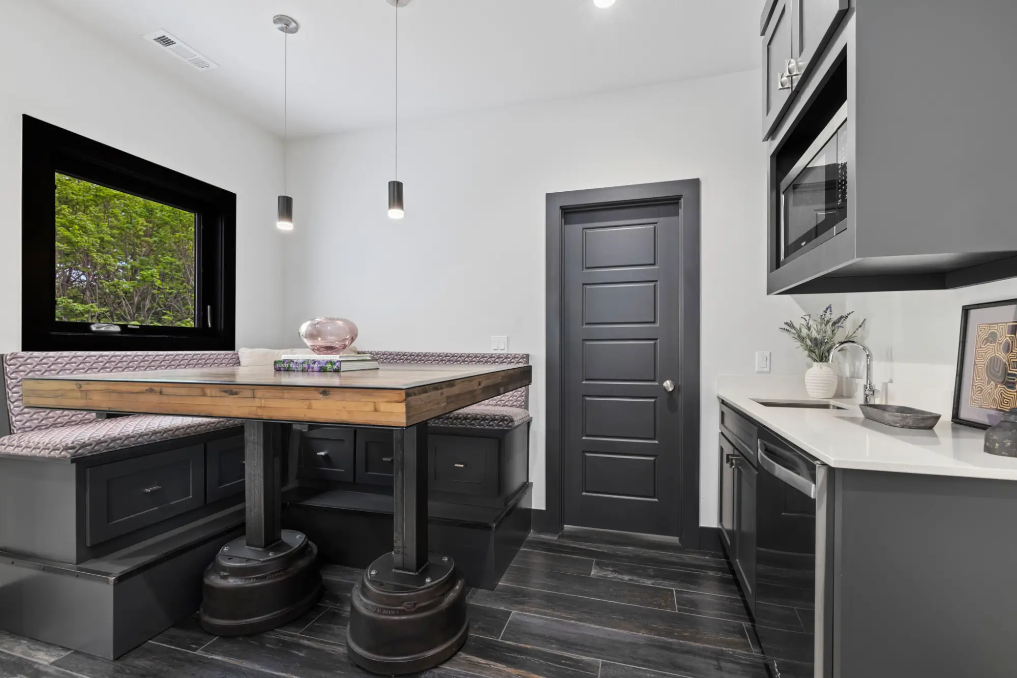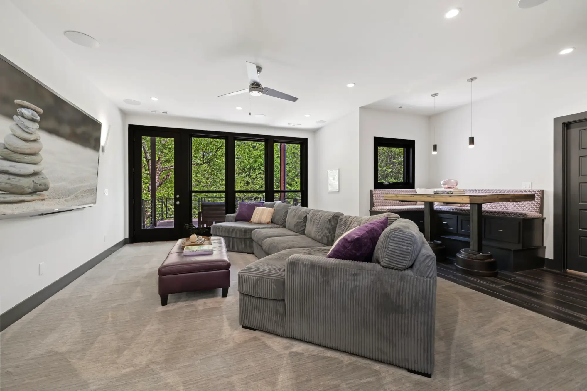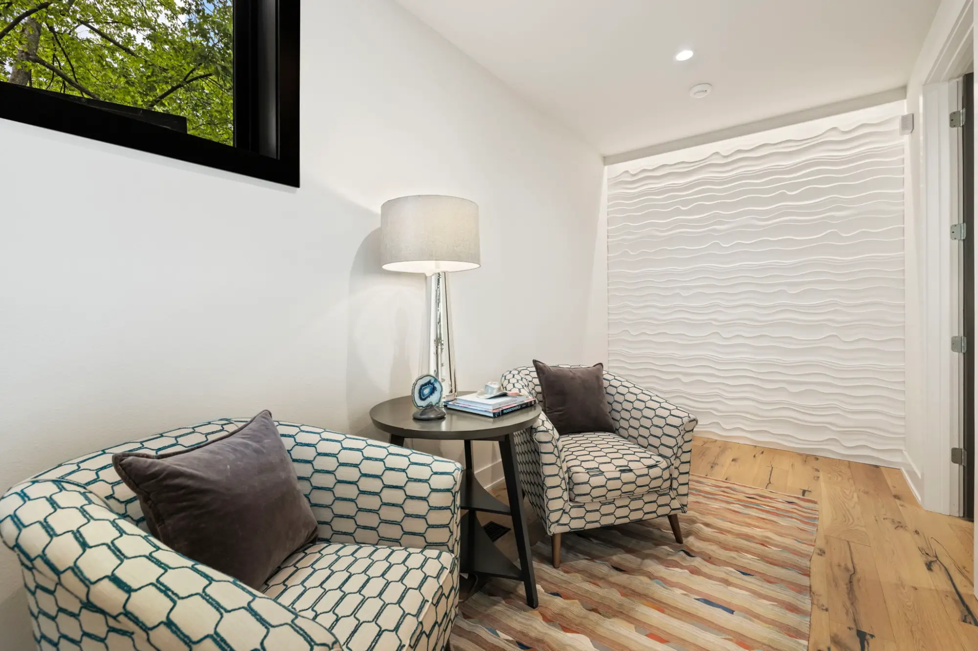 Upstairs, the home continues to reveal moments of comfort and craftsmanship. A corner office occupies its own level between floors - bathed in natural light and supported by a dedicated HVAC system for precise climate control. The bonus room includes 7.1 surround sound, a custom wet bar with refrigerator and microwave, and a raised seating platform with integrated storage centered around a handcrafted metal-and-wood table by local artisans at EcoVet - grounding the space with a sense of place.