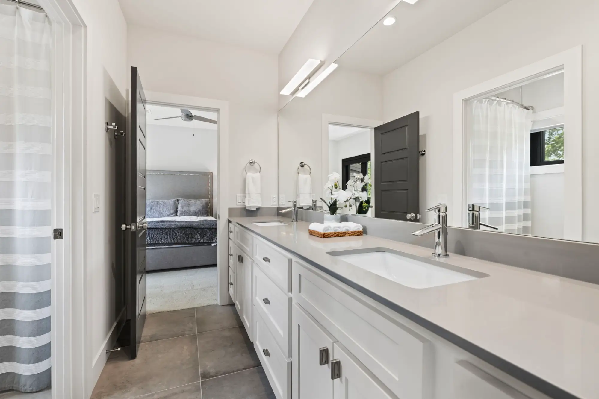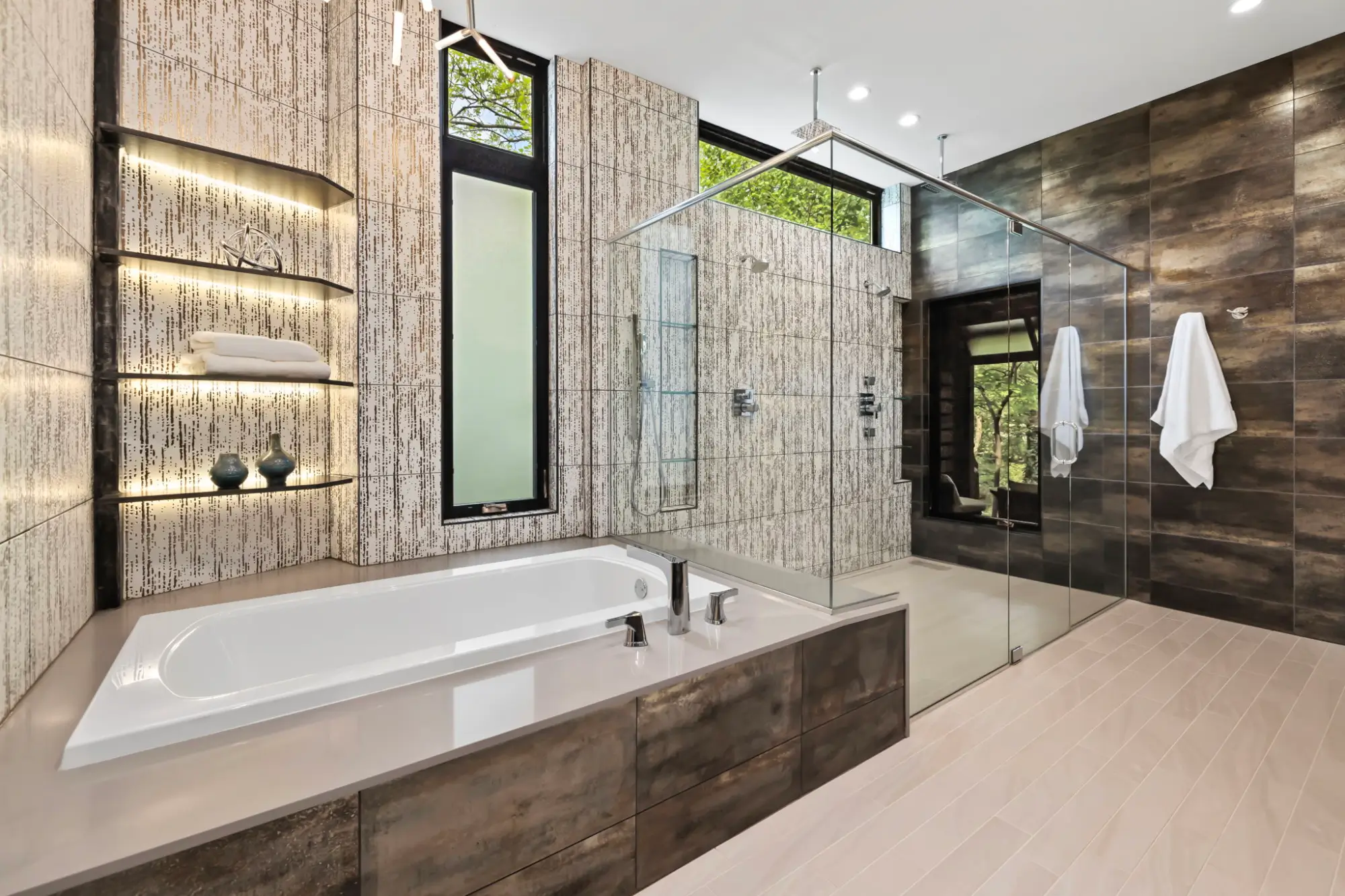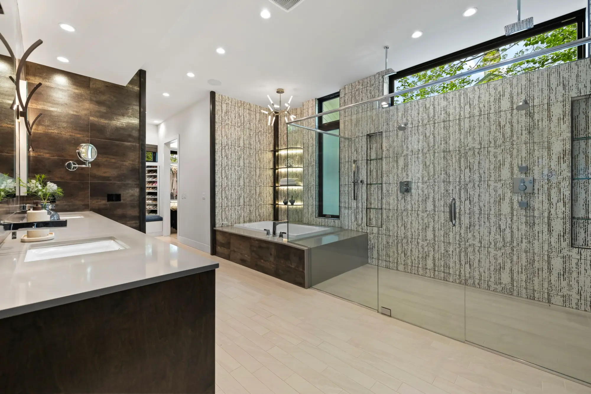The primary suite operates as a private retreat. Floor-to-ceiling windows frame the surrounding canopy, while motorized blackout shades allow complete control of light and privacy. A private porch extends the experience outdoors, featuring a frosted glass roll-up door that transitions between open-air connection and quiet seclusion. In the bath, full-height tilework, transom windows, and metal trim details create a refined, spa-like environment. The walk-in shower is positioned to capture natural light while maintaining privacy, and the dressing areas include a center-island closet and a separate floor-to-ceiling shoe gallery - both meticulously designed for organization and display.