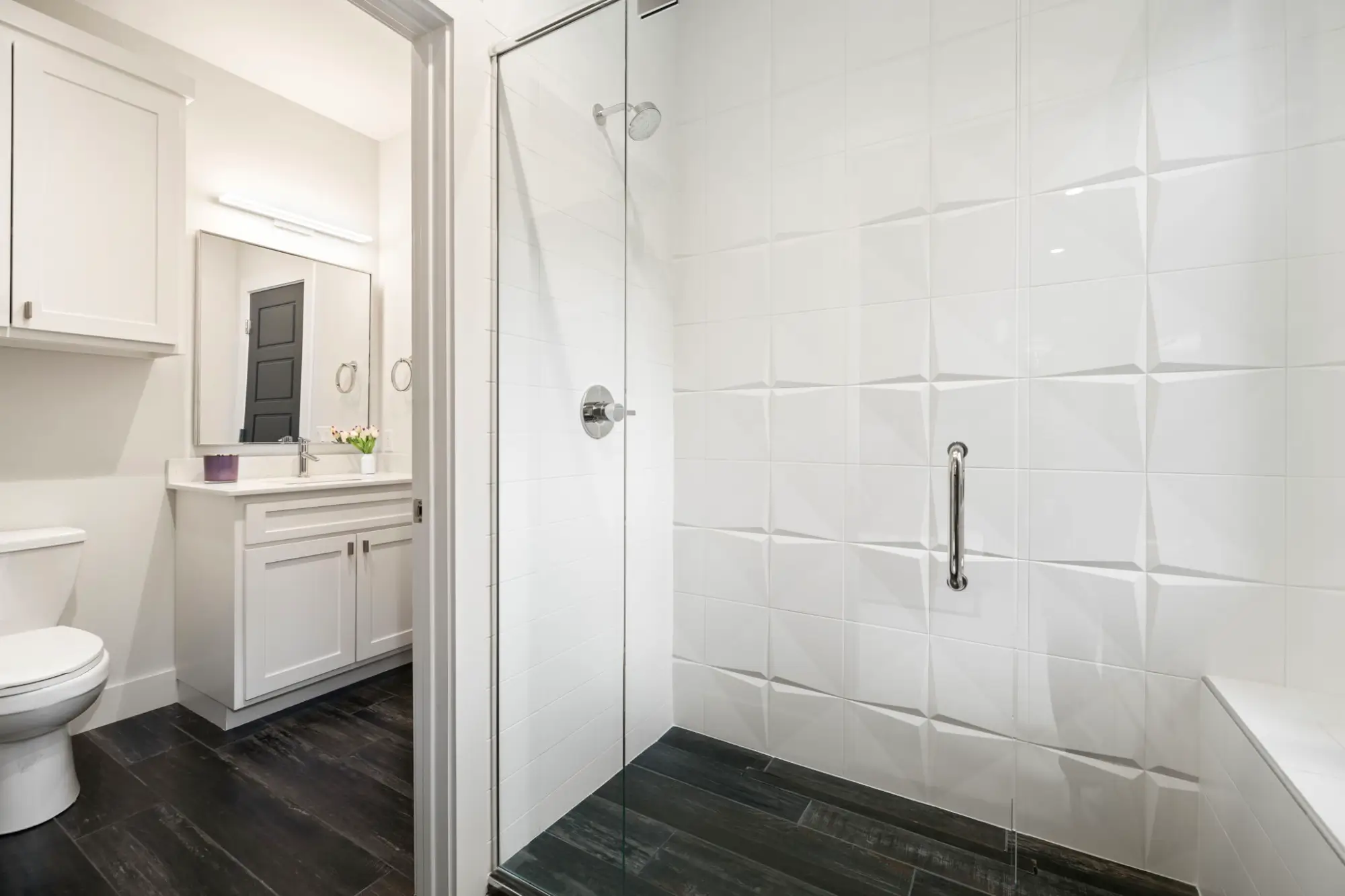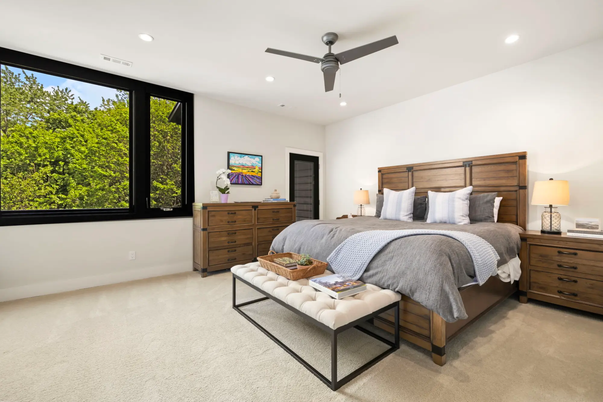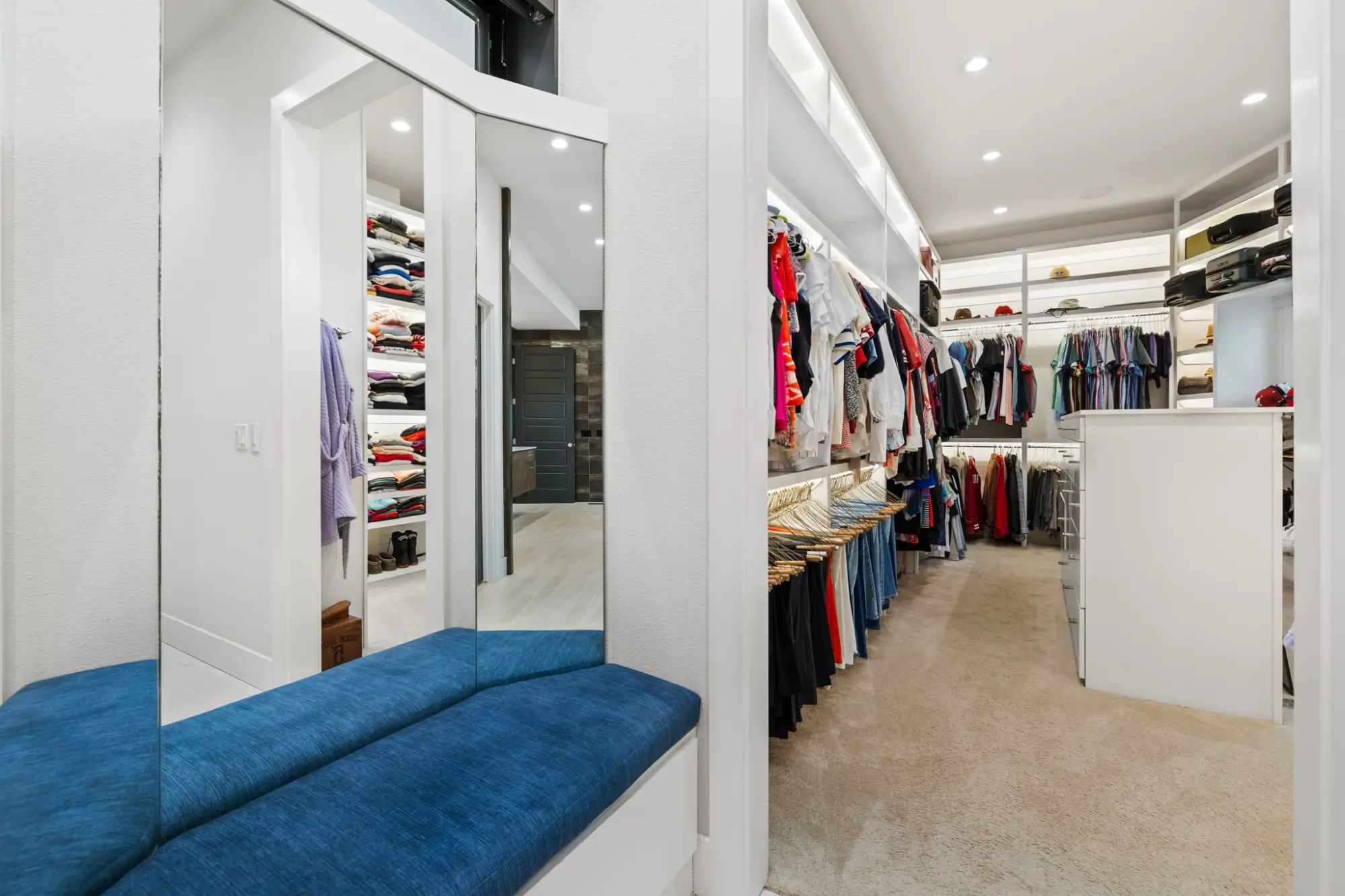 The primary suite operates as a private retreat. Floor-to-ceiling windows frame the surrounding canopy, while motorized blackout shades allow complete control of light and privacy. A private porch extends the experience outdoors, featuring a frosted glass roll-up door that transitions between open-air connection and quiet seclusion. In the bath, full-height tilework, transom windows, and metal trim details create a refined, spa-like environment. The walk-in shower is positioned to capture natural light while maintaining privacy, and the dressing areas include a center-island closet and a separate floor-to-ceiling shoe gallery - both meticulously designed for organization and display.