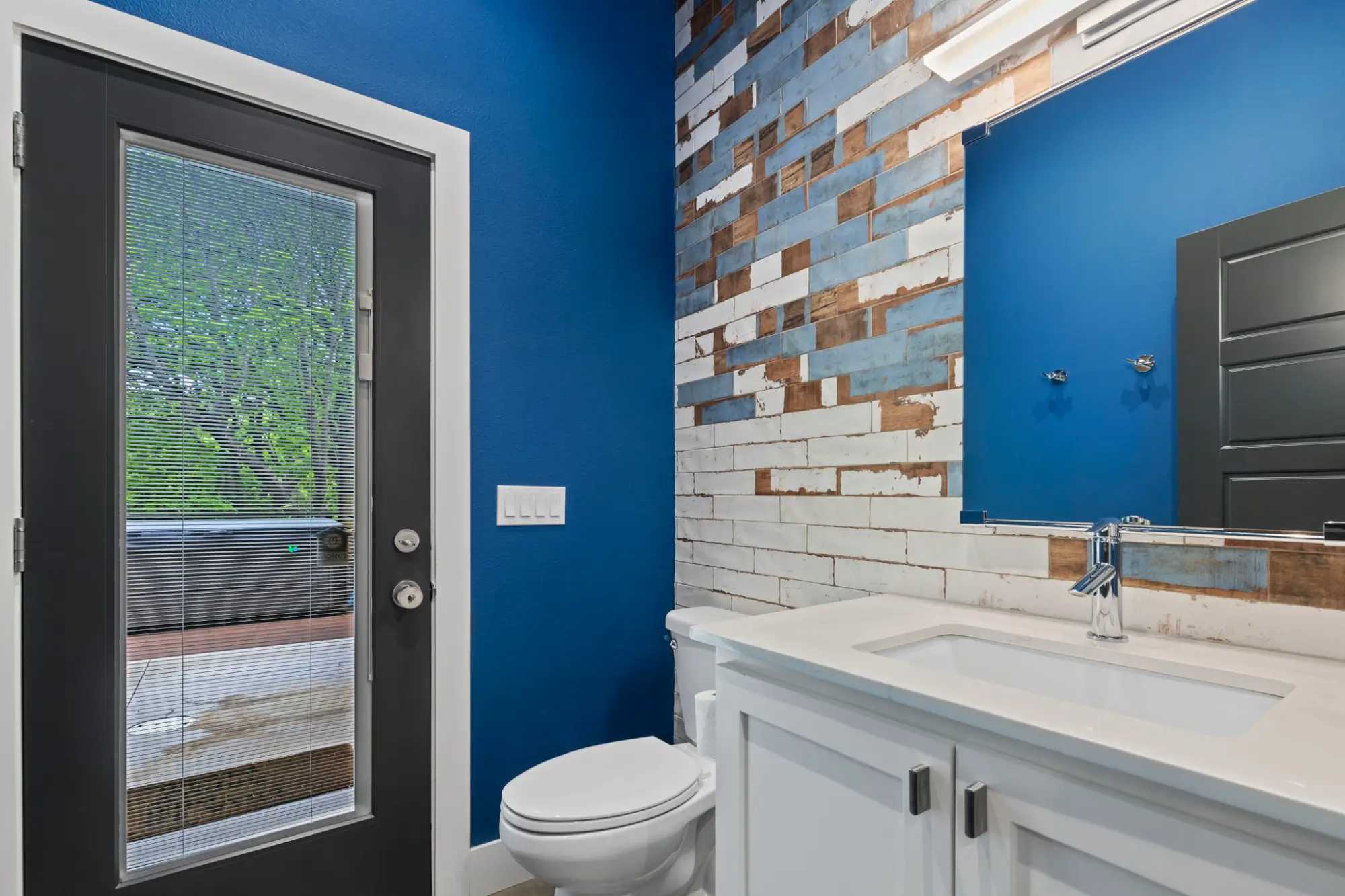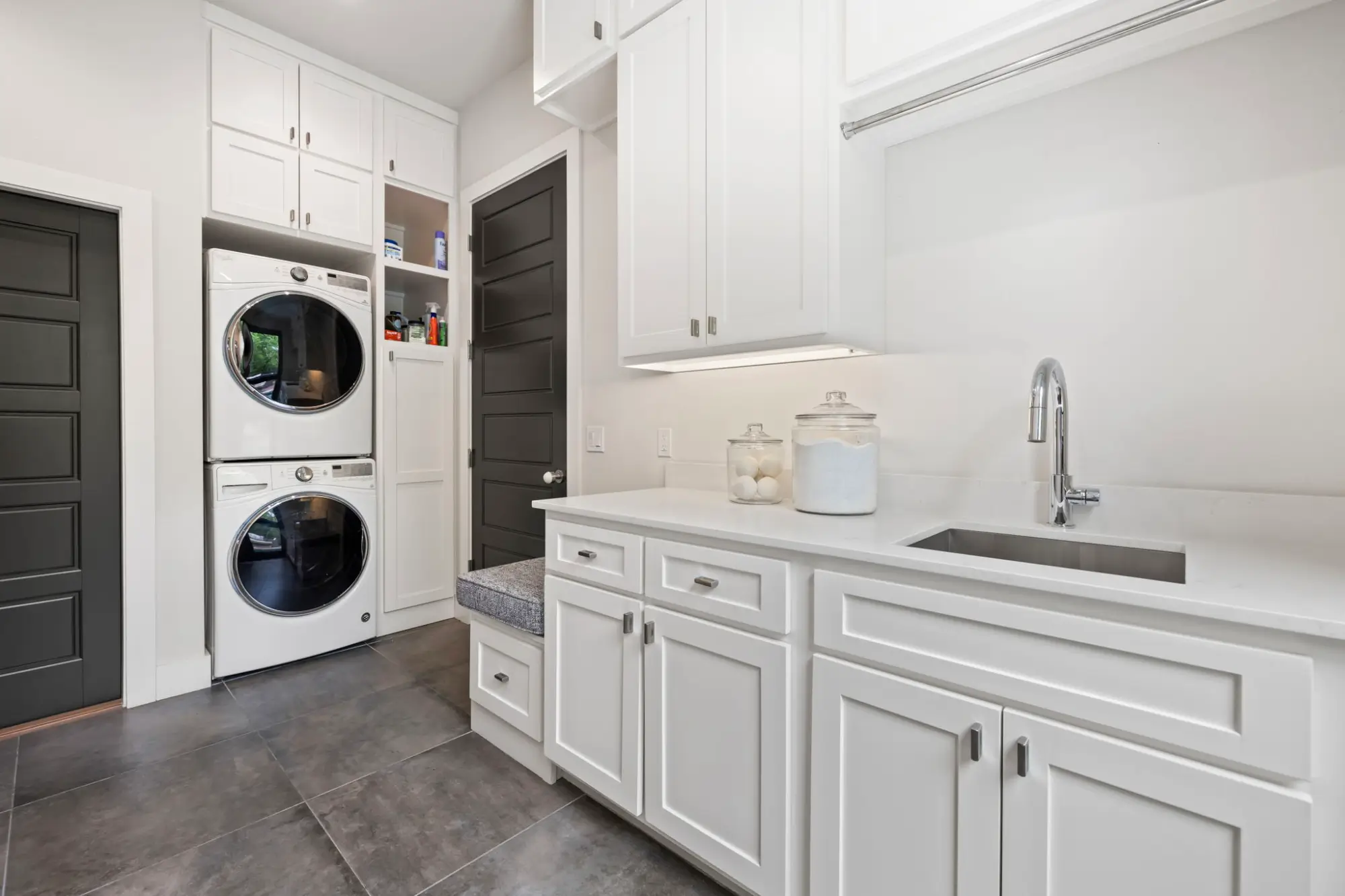 A full gym with adjoining powder bath overlooks the backyard and is positioned conveniently between the pool and utility spaces. Finished with 8mm vulcanized rubber flooring, the space is purpose-built for performance while maintaining the home’s overall design continuity.