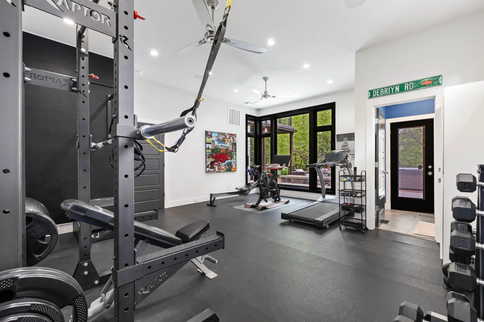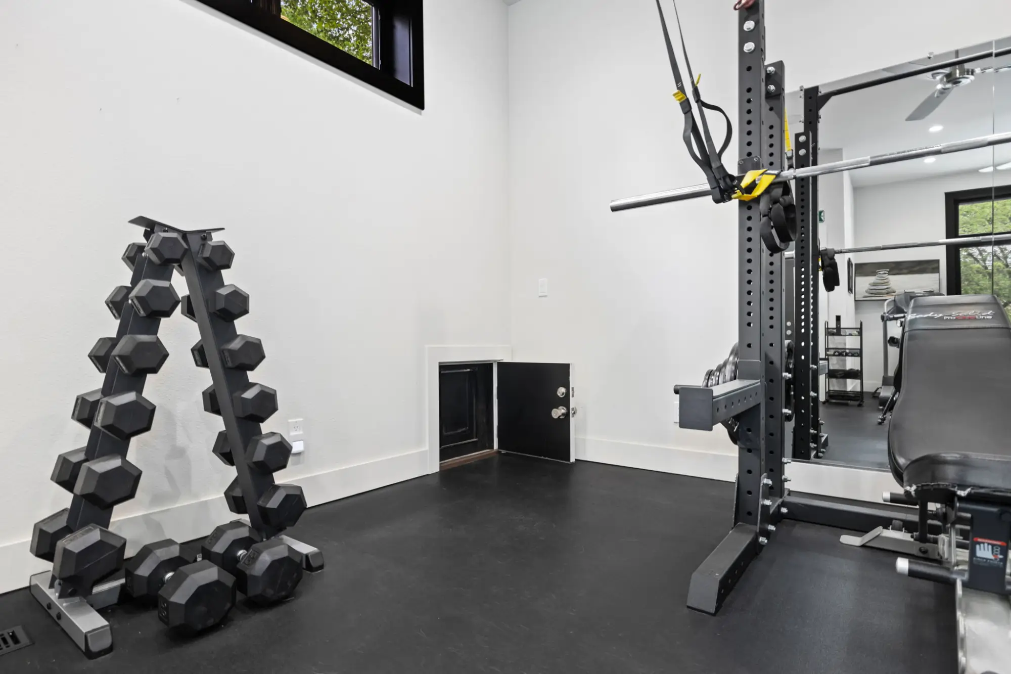 8mm vulcanized rubber gym flooring, extensive built-in storage and lighting