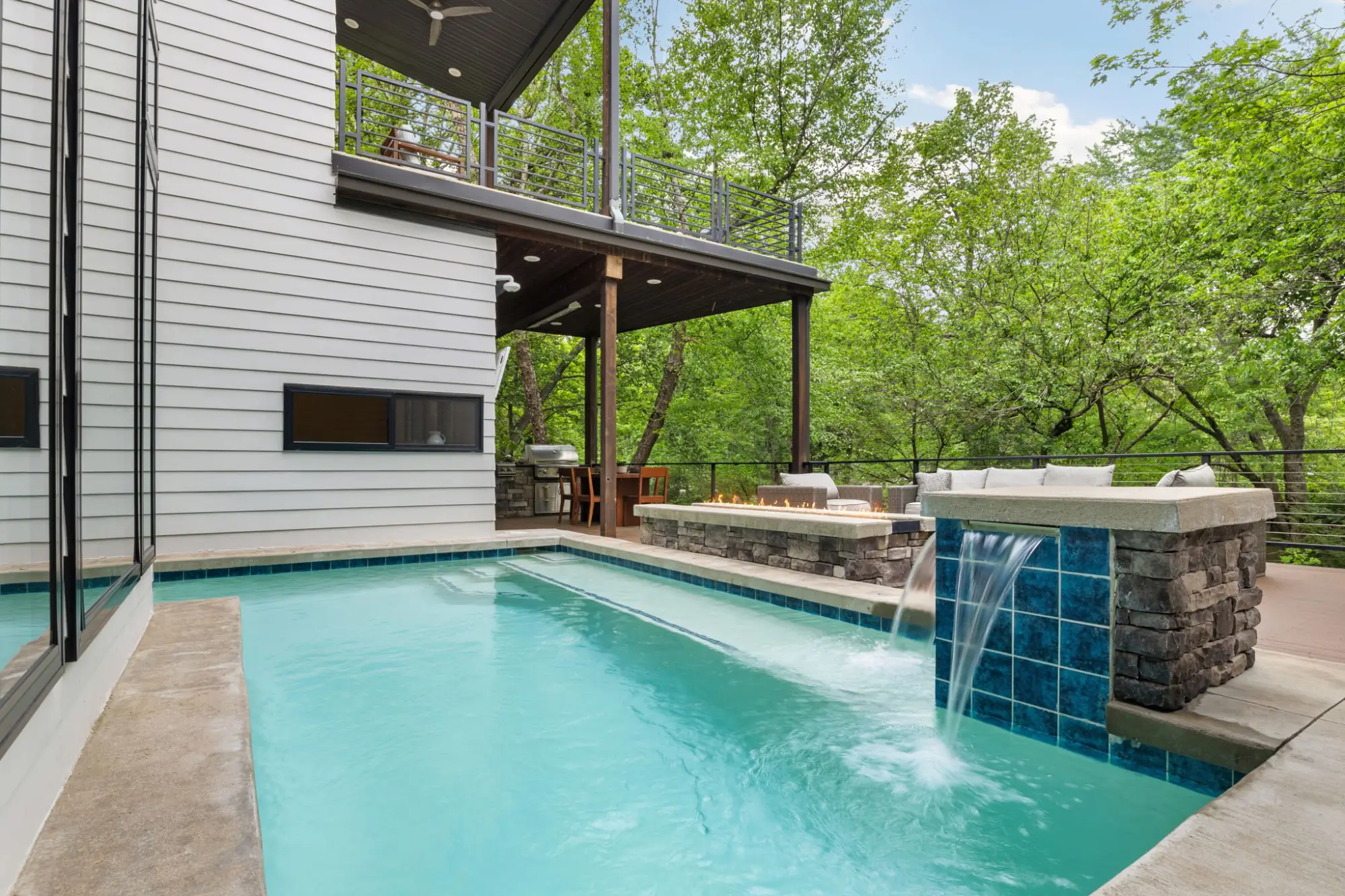 The pool and outdoor living areas are designed for connection. A gunite pool offers space for both relaxation and gathering, complemented by a separate spa for year-round use. A pass-through window from the kitchen supports effortless entertaining, while a modern fire feature with glass media introduces warmth and contrast against the natural surroundings. Nearby, a covered dining area with wood ceiling detailing, built-in heater, and outdoor cooking station extends the interior living experience outward.