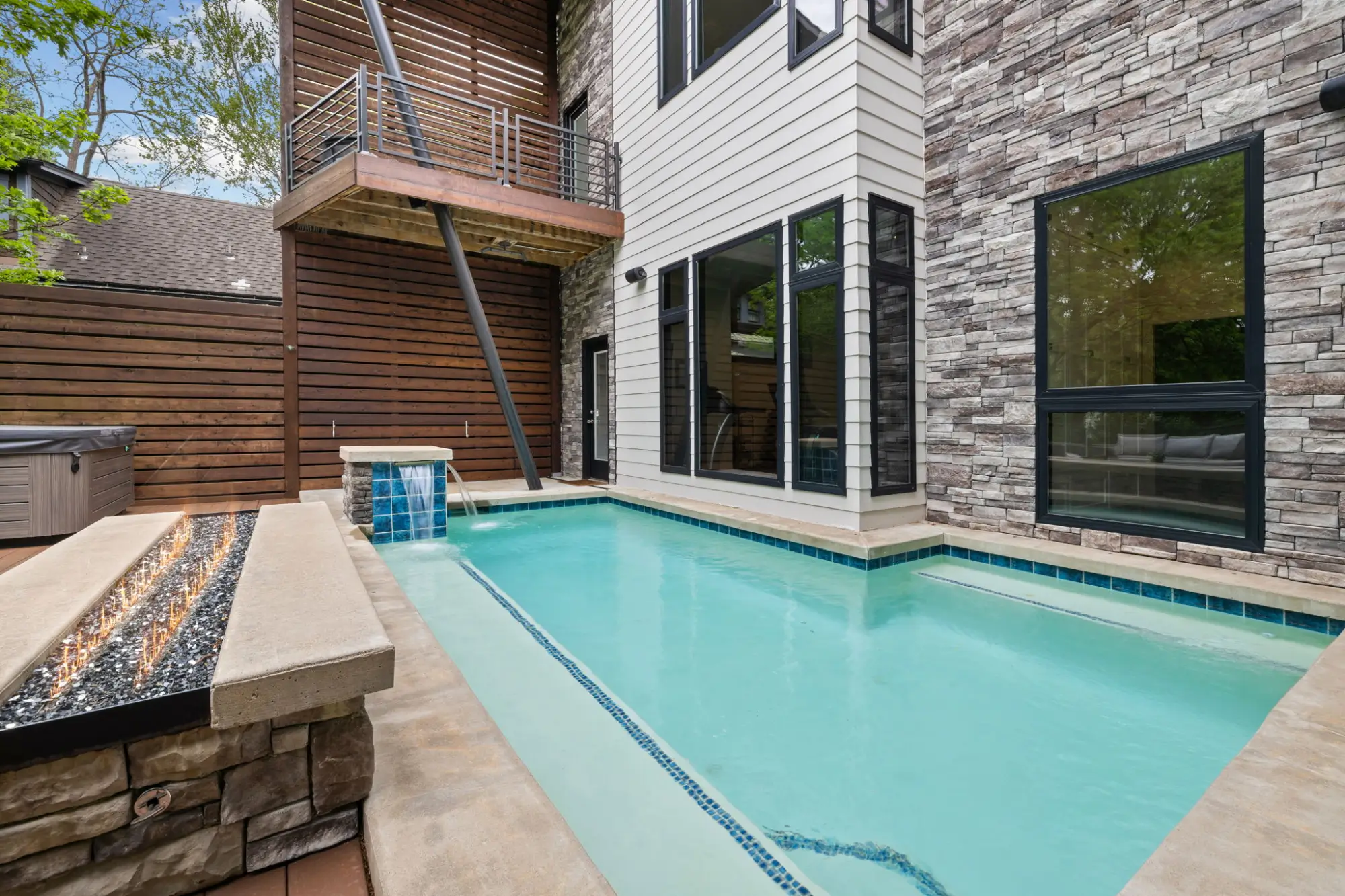 Gunite pool, separate spa, modern fire feature, covered dining with heater and grill